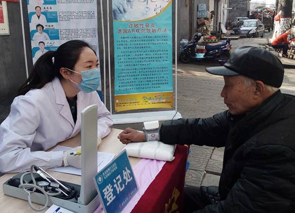 医护人员正在为陈大爷测血压